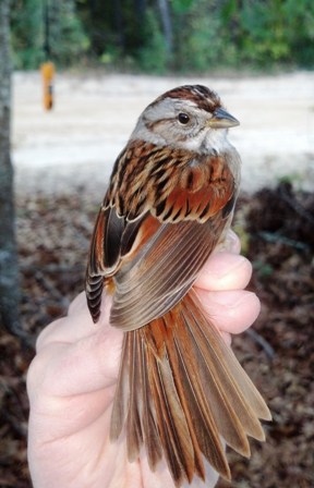 Once a bird like this swamp sparrow has been banded, weighed, poked, and prodded, I’m eager to get it back in the trees so that it can return to its daily work of feeding and protecting itself. Unlike humans, birds don’t have grocery stores where they can purchase food, nor do they have warm houses with doors that lock at night. I don’t like to keep them from their work to survive too long. But in order to collect reliable and useful data, when we have a bird in hand, we have to hold on to it tight, making sure it is controlled and isn’t going to injure itself or get loose. While in our company, the birds are trapped, with no easy way to escape. When our work is done, however, I delight in letting the bird go. Out of my forceful grip of confinement, I open my hands and the bird is set free.
