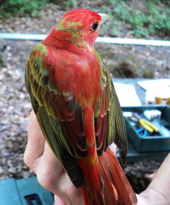 When I lived in South Carolina, I was fortunate enough to work at a bird banding station during the summer and fall each year. One of the things I enjoy about banding birds is the opportunity to see each bird up-close. There is always a level of excitement when banding, as you never know what might be in the net when one is approached. I remember pulling out this beautiful summer tanager one spring and being fascinated by its peculiar color pattern. A bee and wasp specialist, the male summer tanager is the only completely red bird in North America. The bright males are easy to spot during the summer months, while the females, usually a dull yellow, are much more conspicuous.