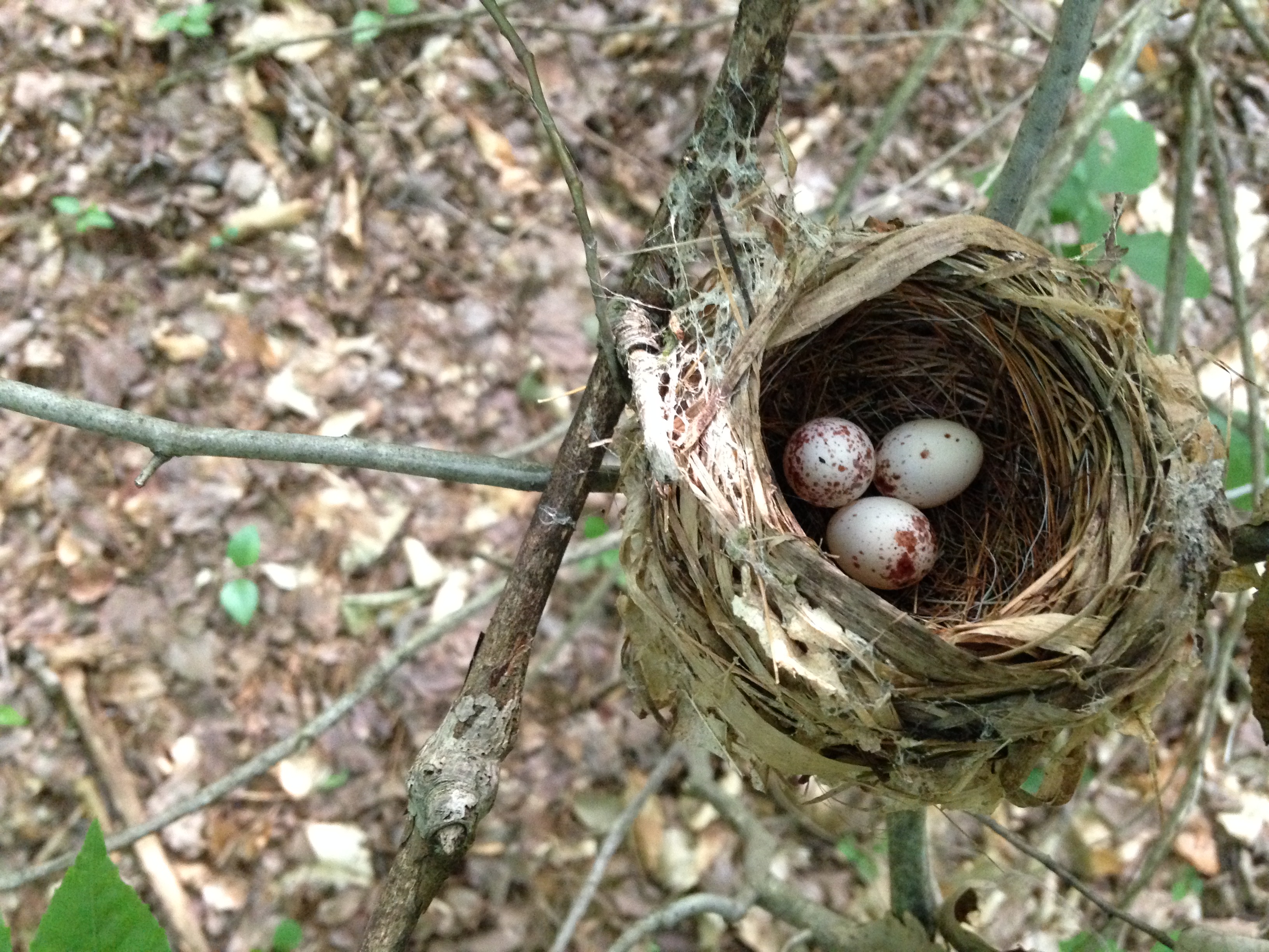 Take the Hooded Warbler (setophaga citrina) nest pictured here that I stumbled on about a month ago. In a literal sense, the little treasure in front of me was a small bowl of woven needles, sticks, and tree bark filled with three penny-sized speckled eggs. But to me, this tiny incubating apparatus three eggs full had all sorts of potential meaning. And herein lies the choice. What will I make of this discovery?