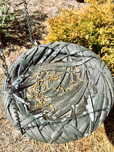 I have a variety of bird feeders in my small backyard that contain different foods to attract as much diversity as possible (sidebar: both in nature and human society, diverse communities tend to be the healthiest, most productive, and the most resilient). For the Eastern Bluebirds and other invertebrate-eating species, I put out dried mealworms a couple of times a day. I typically have a pair of Bluebirds that nest in my backyard in the spring, and it is always fun to watch them raise a new clutch (or two!) of young ones during the summer. Because the Bluebirds in my area stick around throughout the fall and winter, I keep the mealworms coming all year long.